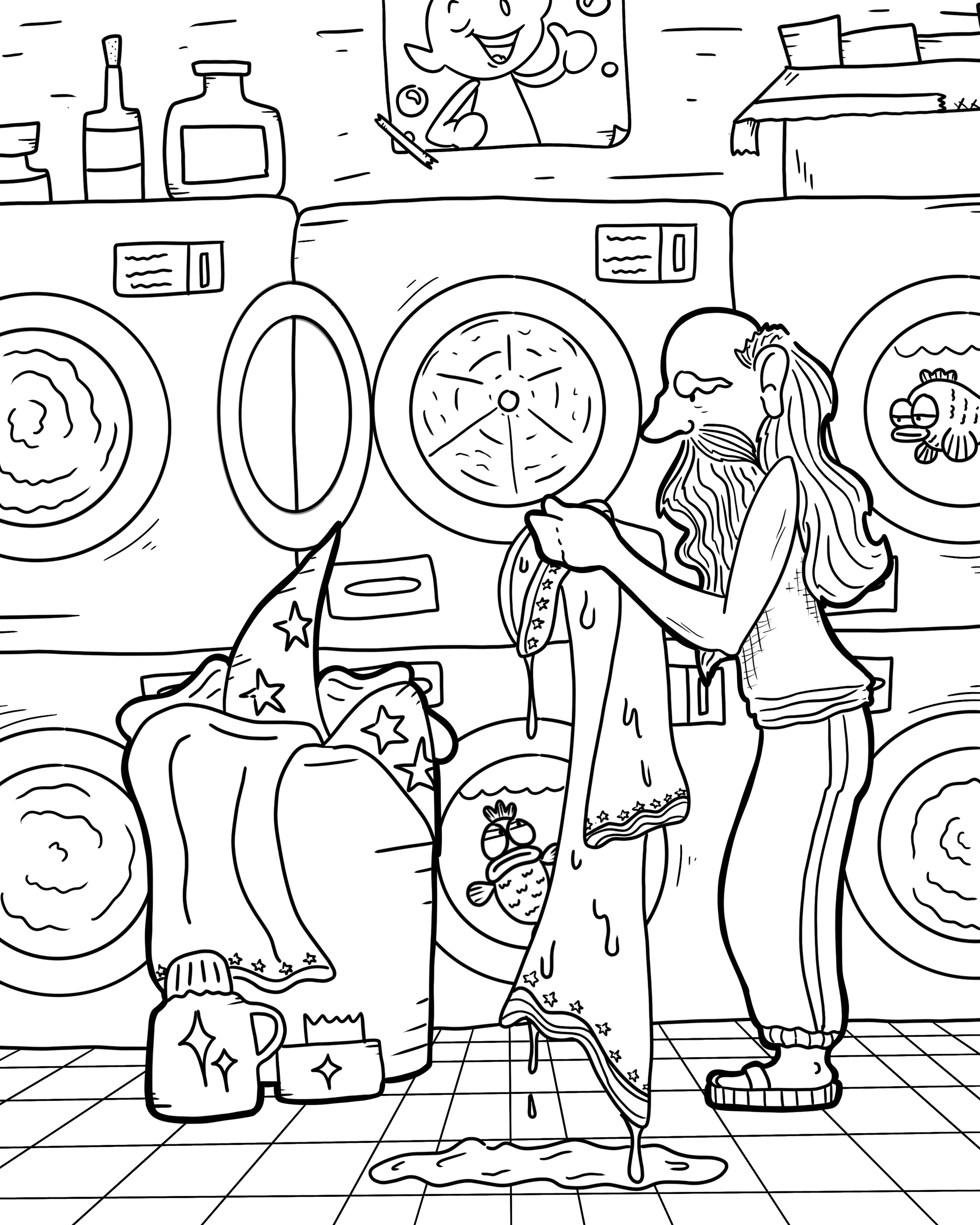 This was my favorite project in Illustration I, where I refined both a coloring page and a whimsical front and back cover through multiple rounds of revisions to create an engaging piece that invites viewers into the idea of a wizard in an everyday setting.